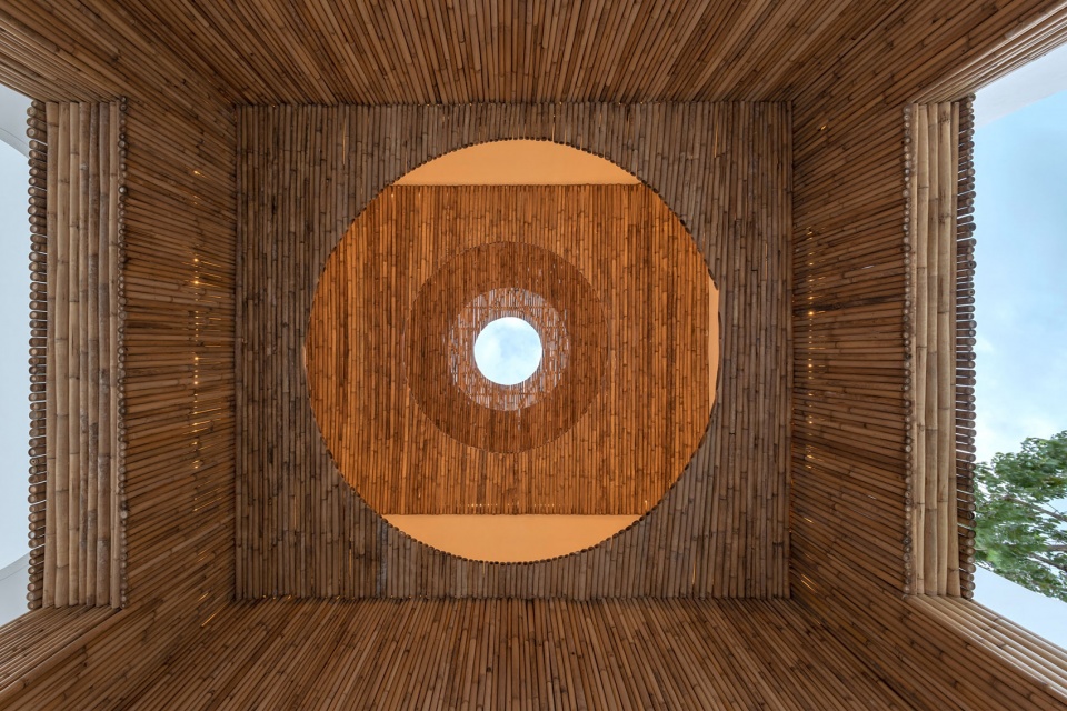 酒店设计关注天空。每个庭院的交接处都设有不同形状、尺寸和材料的垂直天井。连接室外餐厅和室外卧室的是一个由层层竹材组成的长方形空间;室外餐厅与室外客厅间的过渡空间则是一个椭圆形的白色混凝土庭院。在这些空间中,游客可以抬头望向天空,感受阳光的温暖。